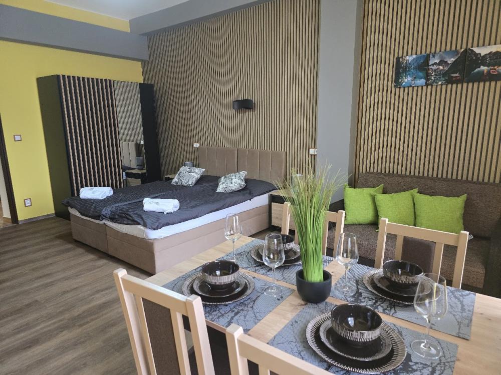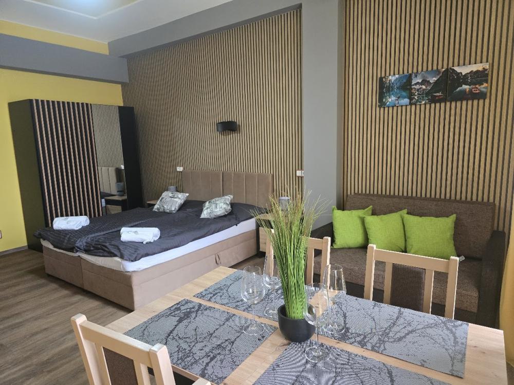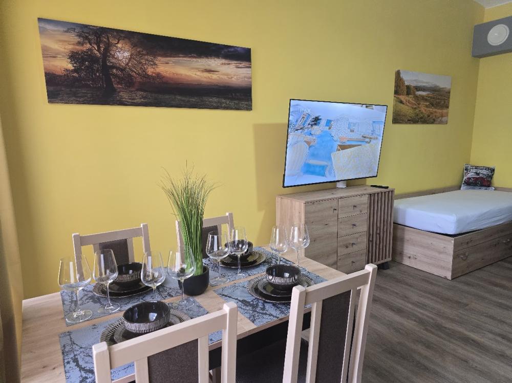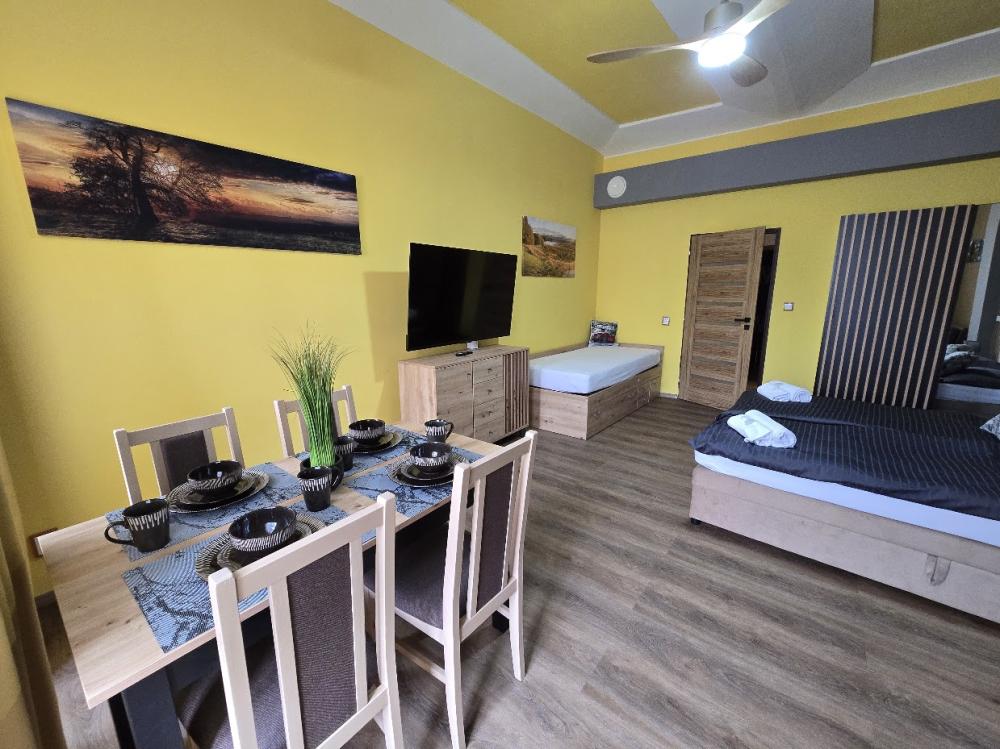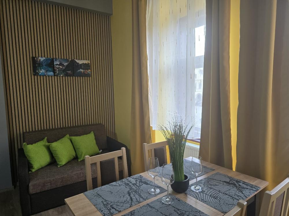 This apartment is suitable for up to 4 guests. It offers a double bed, a single bed, and an extra bed in the form of a sofa bed. The apartment includes a bathroom with a shower and a fully equipped kitchen (refrigerator, microwave, cooktop, dishwasher, electric kettle, dishes, kitchen towels, etc.), also includes a wardrobe, dining table and TV. WIFI is available for free.